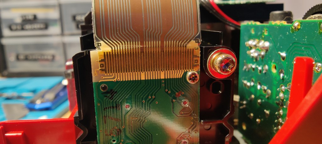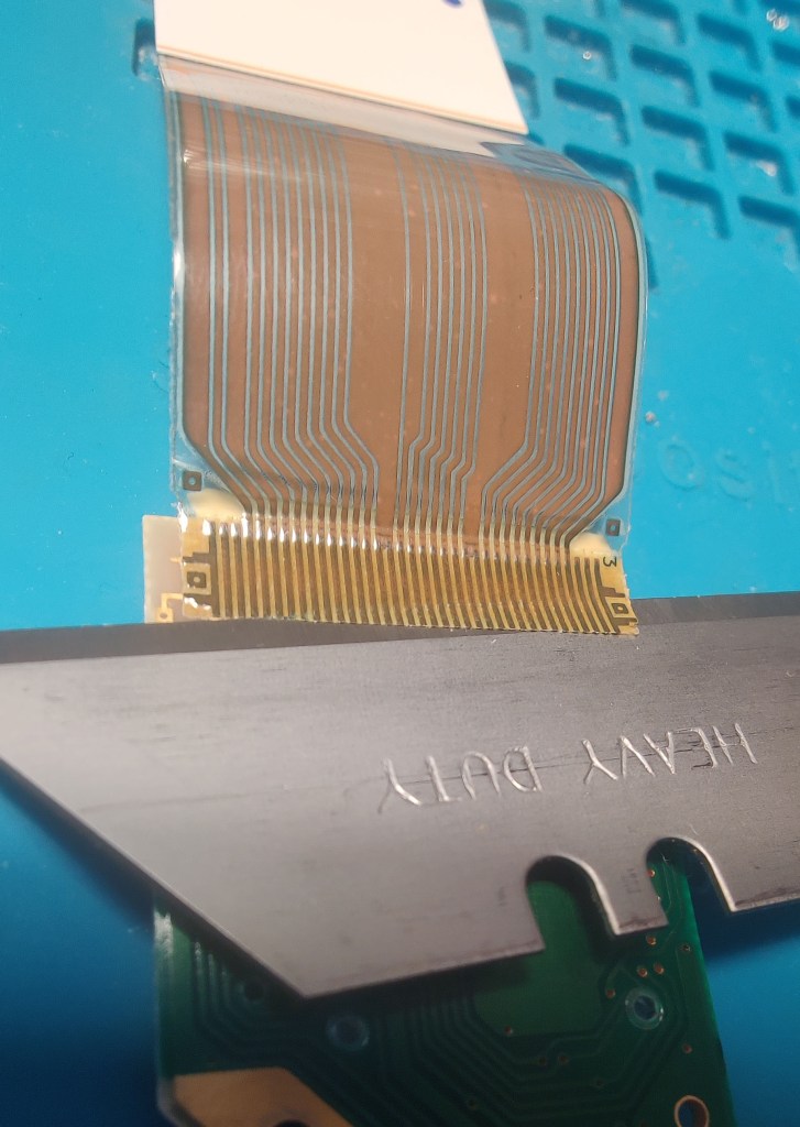 The main PCB has a nice push-fit ribbon cable connector. But on the display PCB, the ribbon cable is glued on. And that, right there, is the problem. Ugh, why glue!?